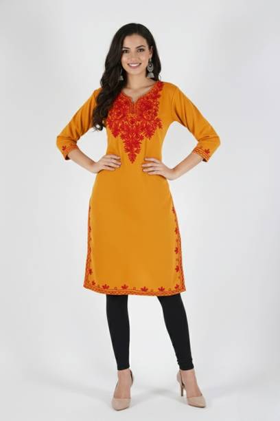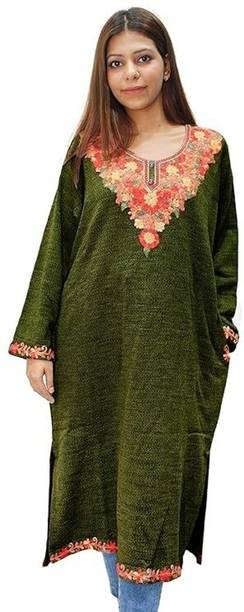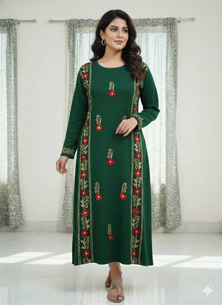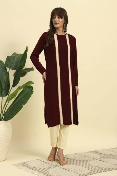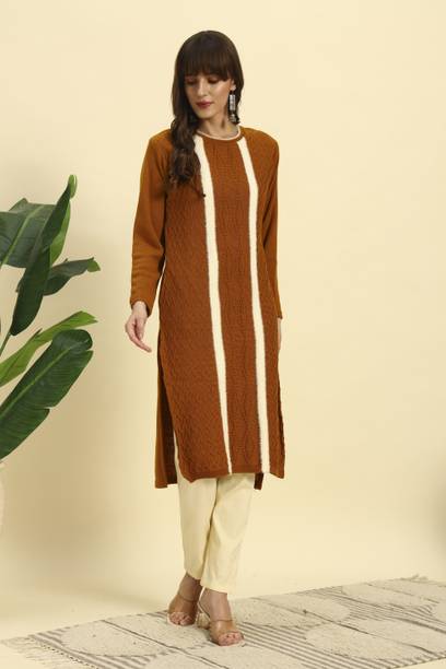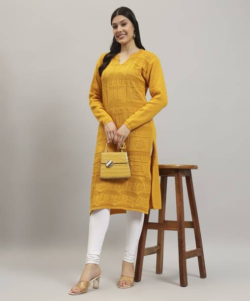 Woollen kurtas are all about comfort and fashion. No need to cover your favourite kurta's style with a sweater during the cold seasons. Instead, this ethnic garment can double as your comfort wear and regular clothes. You can check out the latest woollen kurta collection available online. These woollen attires come in many designs, colours, patterns, and measurements. Check out the latest woollen kurta designs, such as pathani, ethnic, asymmetrical, Anarkali, flared, front slit, etc. Depending on the occasion, you can opt for these designs for a striking look for the winters. These are ideal formal wear for religious festivals, anniversaries, marriage ceremonies, and many other functions. You can choose from geometric prints, tropical prints, Bahaar, mottled Ikkat, sequined sets, block prints, bagru prints, and more. These come in comfortable fabrics like rayon fleece, pure wool, poly crepe, viscose blend, wool blend, etc. All of these cosy Kurtas come in all sizes and measurements. You can buy up to 7XL, and it is available in ankle length, calf lengths, above the knee, below the knee, hip length, knee-length, and more. You can also choose from full sleeves, half sleeves, three-fourth sleeves, short sleeves, and sleeveless options. You can check out brands like Anmi, Urban Creation, Saadgi, Essentiele, and Rosary for the best woollen kurtas options. The information you are reading has been last updated on 28-Oct-25.