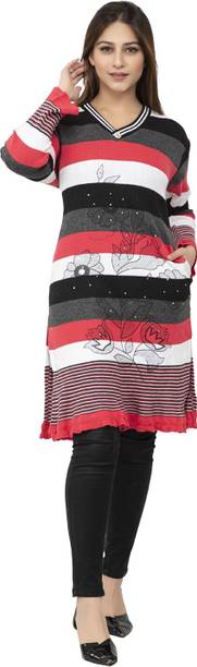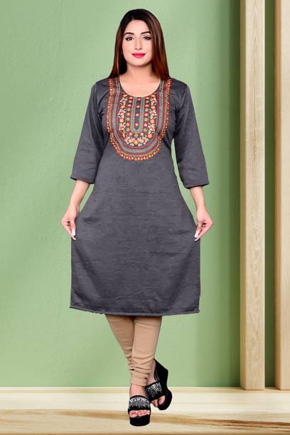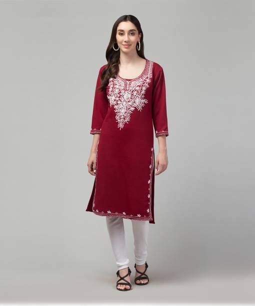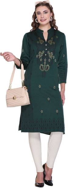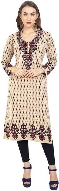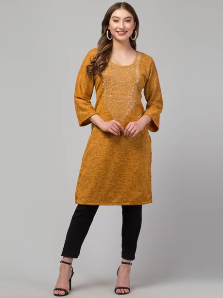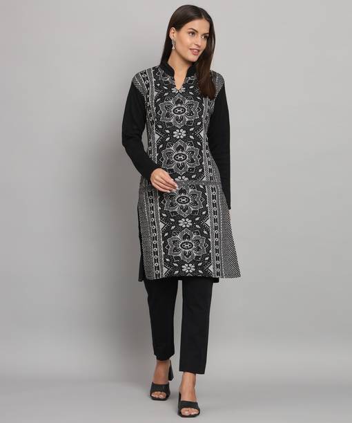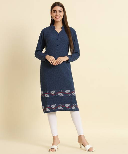 Woollen kurtas are all about comfort and fashion. No need to cover your favourite kurta's style with a sweater during the cold seasons. Instead, this ethnic garment can double as your comfort wear and regular clothes. You can check out the latest woollen kurta collection available online. These woollen attires come in many designs, colours, patterns, and measurements. Check out the latest woollen kurta designs, such as pathani, ethnic, asymmetrical, Anarkali, flared, front slit, etc. Depending on the occasion, you can opt for these designs for a striking look for the winters. These are ideal formal wear for religious festivals, anniversaries, marriage ceremonies, and many other functions. You can choose from geometric prints, tropical prints, Bahaar, mottled Ikkat, sequined sets, block prints, bagru prints, and more. These come in comfortable fabrics like rayon fleece, pure wool, poly crepe, viscose blend, wool blend, etc. All of these cosy Kurtas come in all sizes and measurements. You can buy up to 7XL, and it is available in ankle length, calf lengths, above the knee, below the knee, hip length, knee-length, and more. You can also choose from full sleeves, half sleeves, three-fourth sleeves, short sleeves, and sleeveless options. You can check out brands like Anmi, Urban Creation, Saadgi, Essentiele, and Rosary for the best woollen kurtas options. The information you are reading has been last updated on 09-Oct-25.