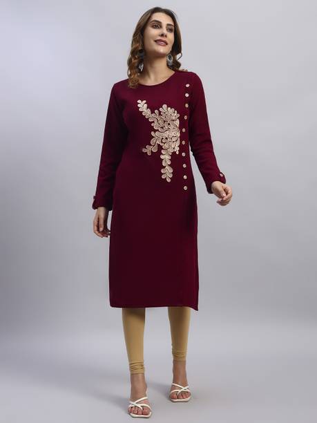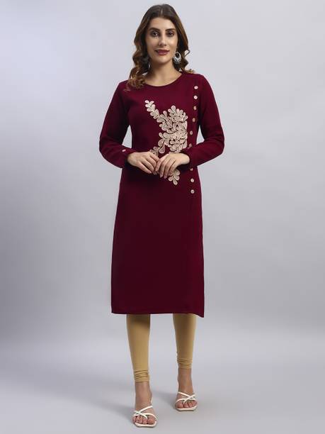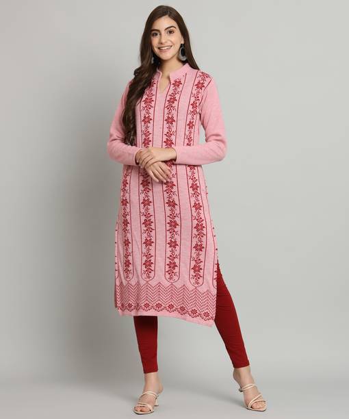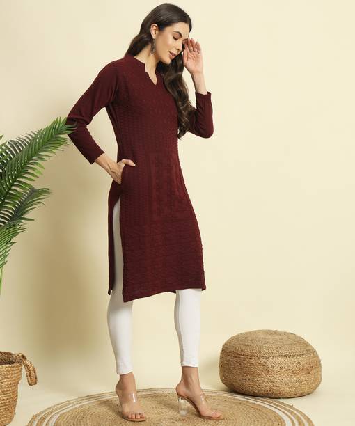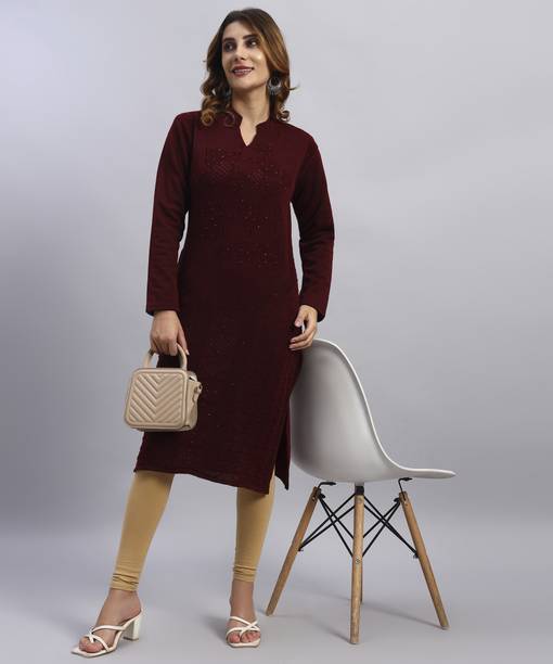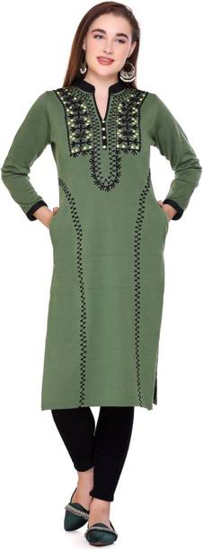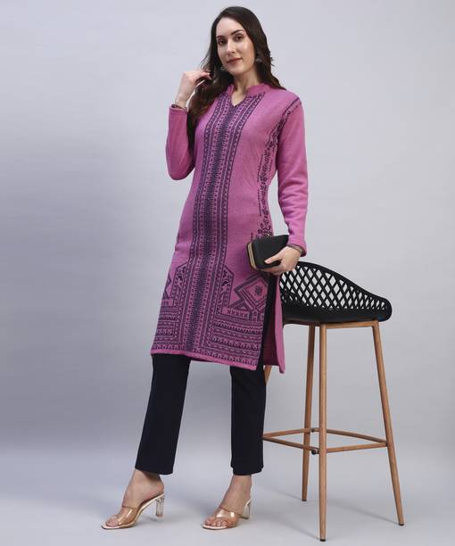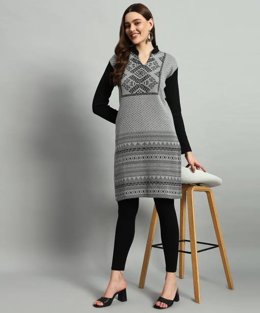 Woollen kurtas are all about comfort and fashion. No need to cover your favourite kurta's style with a sweater during the cold seasons. Instead, this ethnic garment can double as your comfort wear and regular clothes. You can check out the latest woollen kurta collection available online. These woollen attires come in many designs, colours, patterns, and measurements. Check out the latest woollen kurta designs, such as pathani, ethnic, asymmetrical, Anarkali, flared, front slit, etc. Depending on the occasion, you can opt for these designs for a striking look for the winters. These are ideal formal wear for religious festivals, anniversaries, marriage ceremonies, and many other functions. You can choose from geometric prints, tropical prints, Bahaar, mottled Ikkat, sequined sets, block prints, bagru prints, and more. These come in comfortable fabrics like rayon fleece, pure wool, poly crepe, viscose blend, wool blend, etc. All of these cosy Kurtas come in all sizes and measurements. You can buy up to 7XL, and it is available in ankle length, calf lengths, above the knee, below the knee, hip length, knee-length, and more. You can also choose from full sleeves, half sleeves, three-fourth sleeves, short sleeves, and sleeveless options. You can check out brands like Anmi, Urban Creation, Saadgi, Essentiele, and Rosary for the best woollen kurtas options. The information you are reading has been last updated on 09-Oct-25.