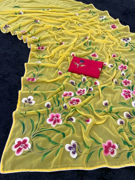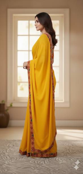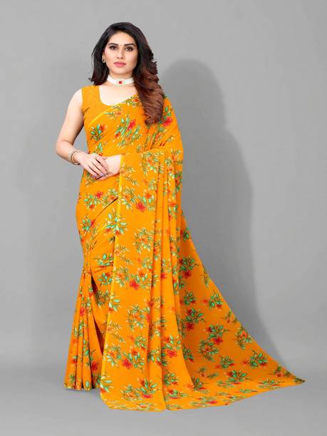 Yellow Georgette Saree with Floral Printed Border - Don’t you think multi-colored floral printed border decorated on a solid yellow saree will look stunning? Oh, it surely will and you certainly need to try this style. A collar neck silk blouse with matching prints will further enhance the appeal of this look. Drape this yellow saree perfectly around your silhouette, add on bold statement earrings, a bracelet cuff and step into slim heels to make heads turn.