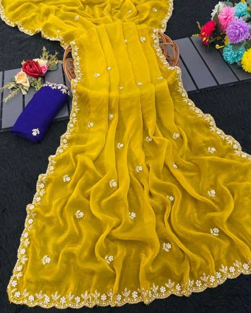 White and Yellow Embroidered Fashion Handloom Chiffon Saree - White and yellow is yet another magnificent combination. White blended beautifully in a yellow handloom chiffon sarees will look charismatic. And when there is embroidered designing on the borders of the saree, it will further accentuate the style. You can pair this saree with a tie-up blouse and accessorize with hoop earrings. Carry a chic clutch and slip into a pair of heeled sandals to make a stylish impression.