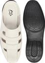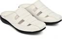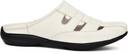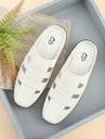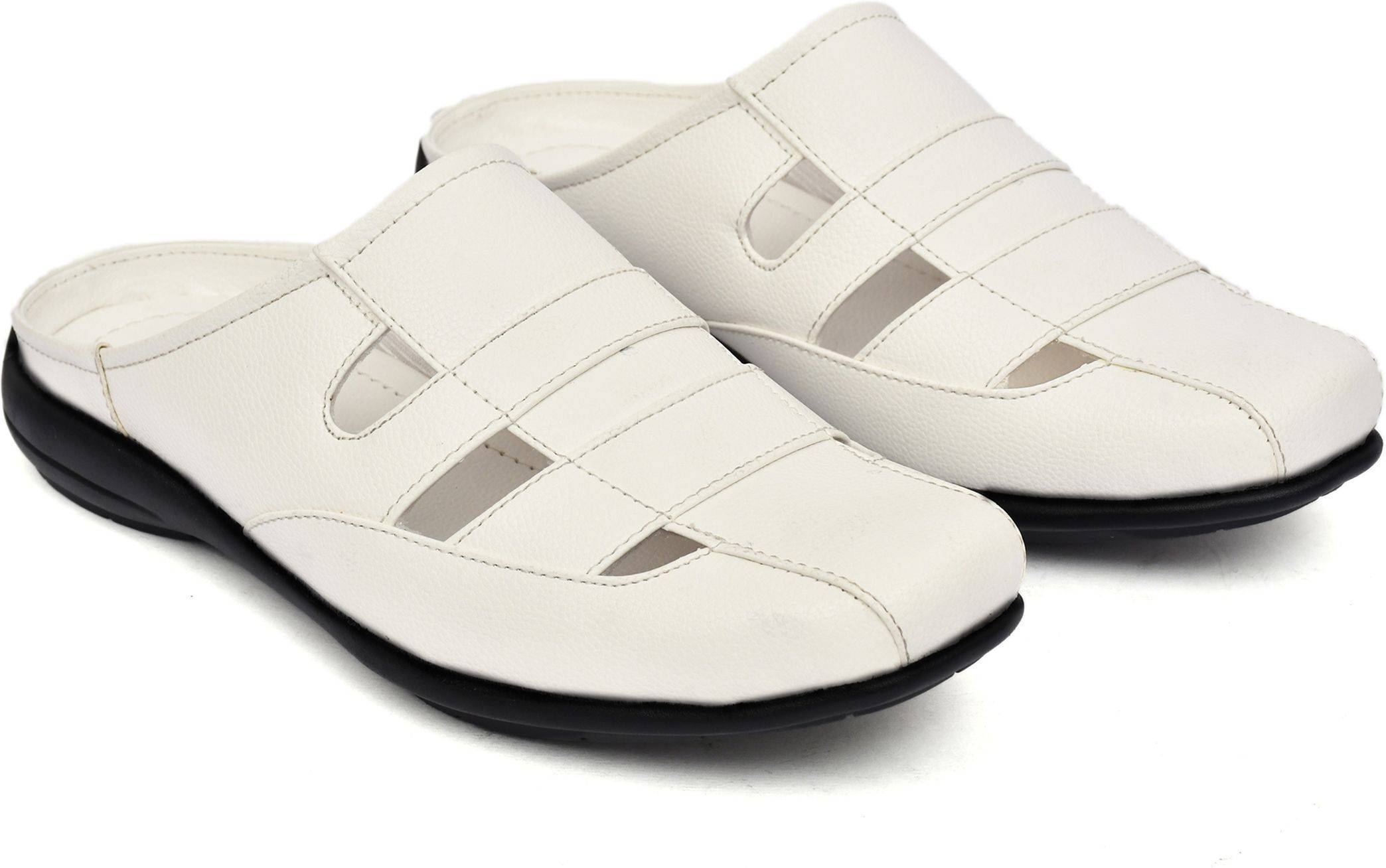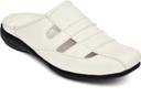 This is a pair of white slip-on sandals featuring a closed, square-toe design and an open back. The upper is crafted from a synthetic leather-like material with a woven pattern, characterized by horizontal straps and cut-out details for breathability. It has a comfortable flat black sole with a textured pattern for grip. These sandals are ideal for casual wear. They would complement outfits such as shorts, jeans, light trousers, casual shirts, and t-shirts.