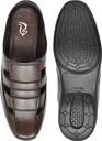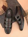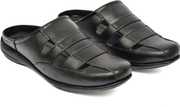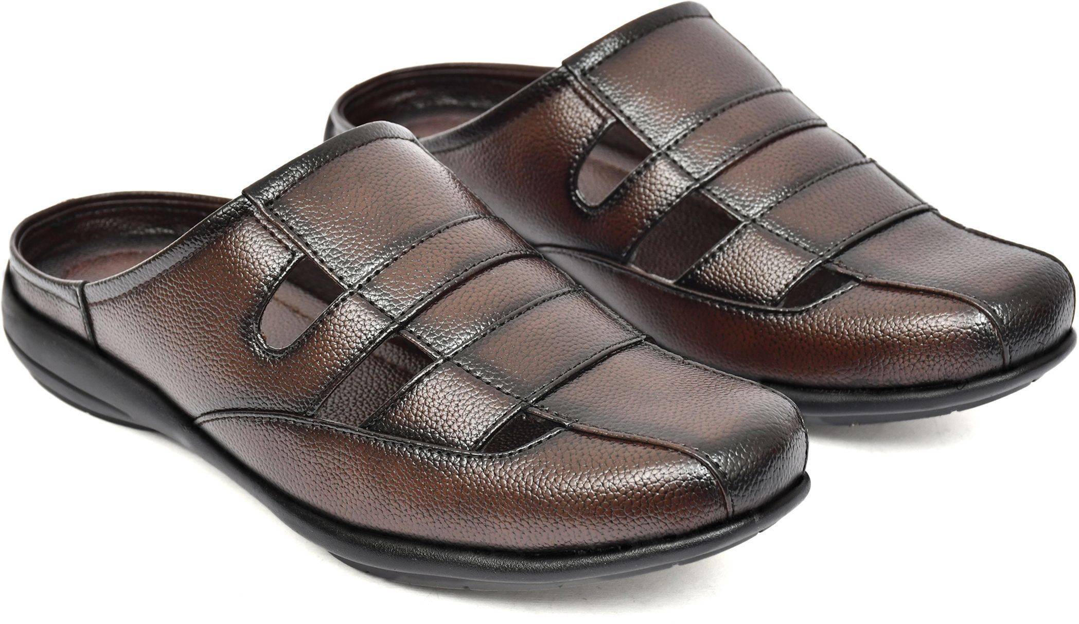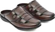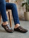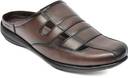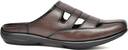 This men's sandal features a rich brown, textured synthetic leather upper with a multi-strap design across the foot, providing a secure yet open feel. The front includes cut-out details for breathability. It has an open-back design for easy slip-on wear and is set on a durable, flat black sole with a textured grip pattern. The overall aesthetic is casual and comfortable. Compatible with: Jeans, shorts, casual trousers, t-shirts, polo shirts.