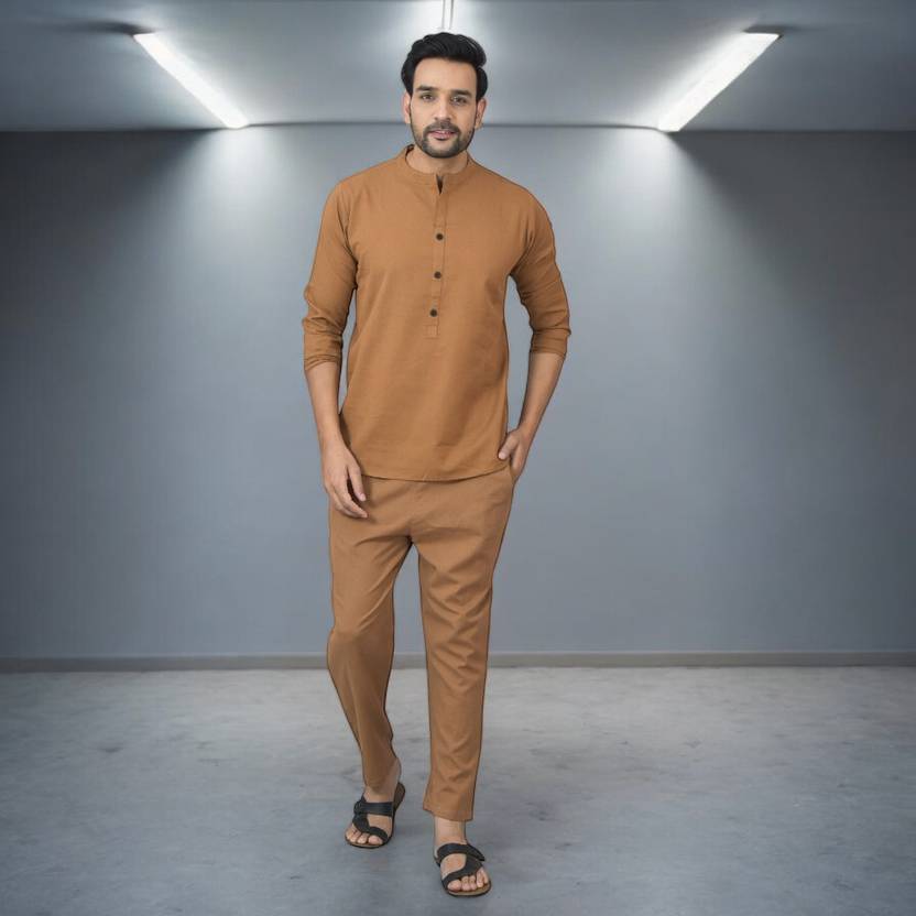 Qashida Men's Cotton Co-ord Set - Kurta & Pant Set, Full Sleeve, Mandarin Collar, Hip Length, 2 Side Pockets