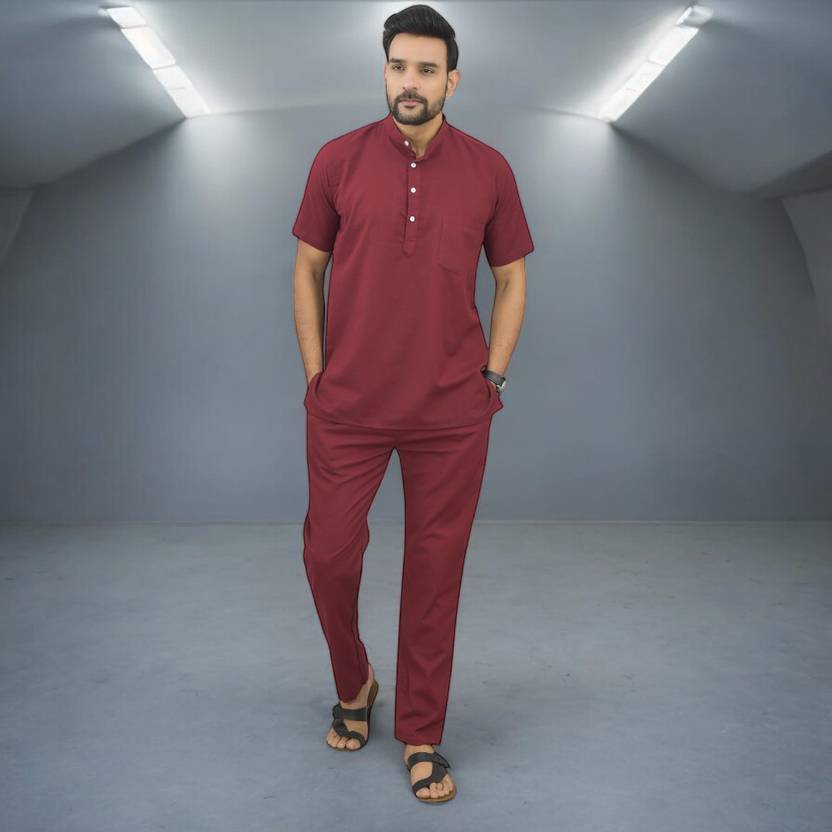 Qashida Men's Cotton Co-ord Set - Kurta & Pant Set, Short Sleeve, Mandarin Collar, Hip-Length, 2 Side Pockets