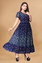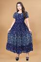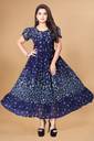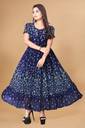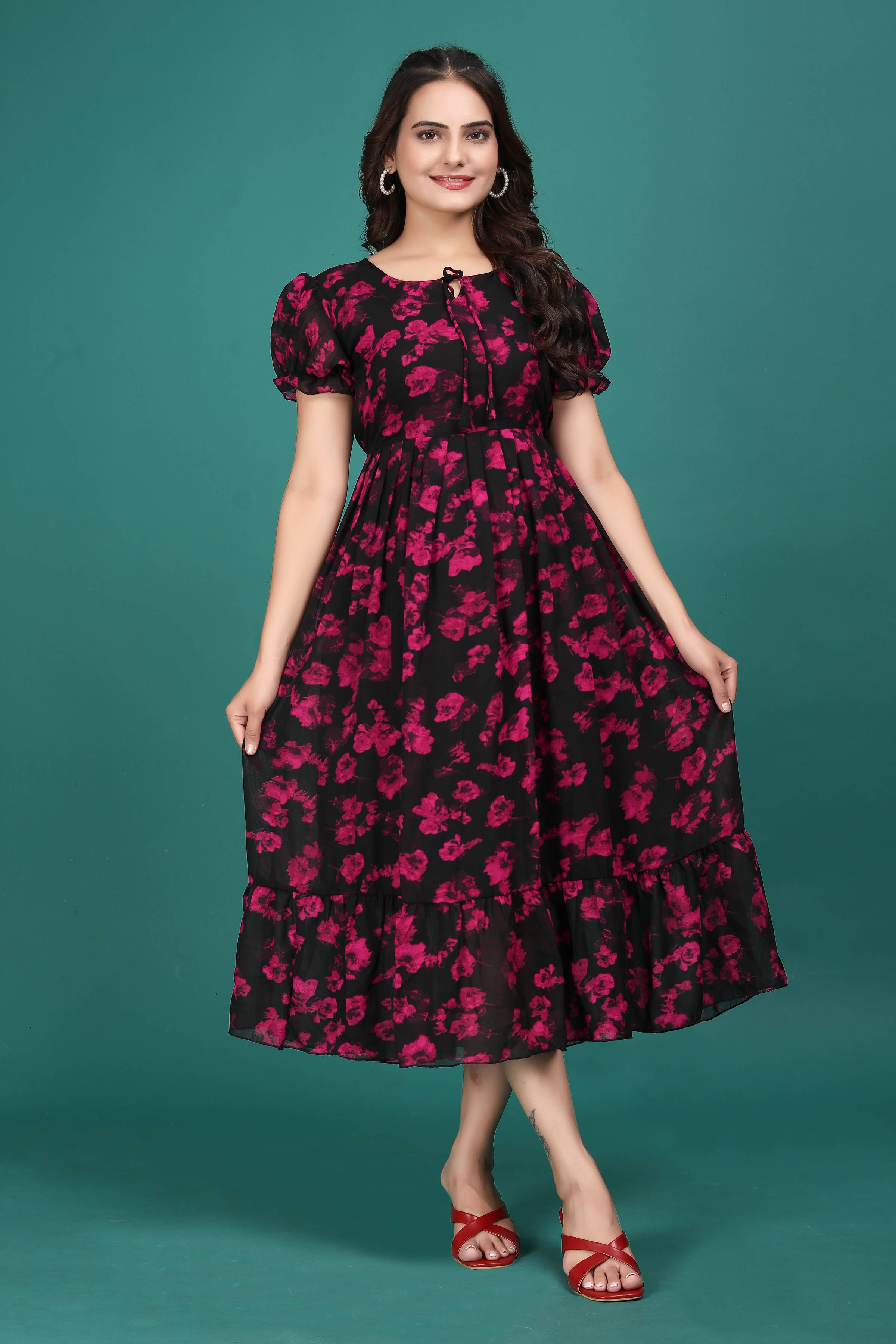 Crafted from soft, breathable fabric, it features a round neckline with a tie-up detail and puff sleeves that add a touch of femininity. The gathered waist flows into a beautifully flared hem, giving the dress a graceful silhouette.