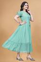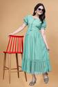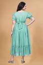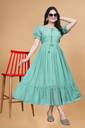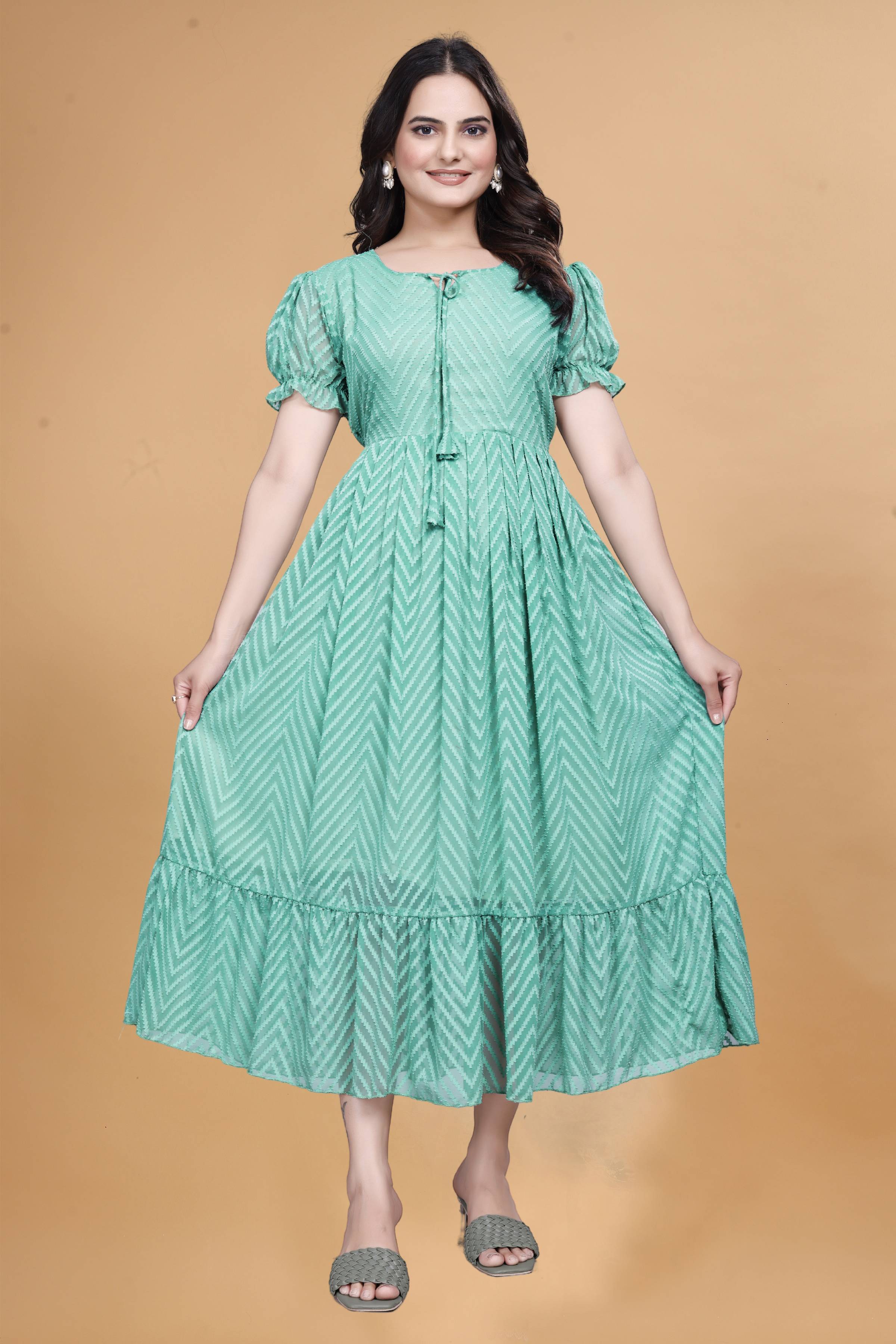 Description-Featuring puff sleeves, a tie-up neckline, and a flattering fit-and-flare silhouette, this dress is perfect for both casual and festive occasions. The subtle chevron textured pattern adds a modern touch, while the soft, flowy fabric ensures comfort and grace all day long. Pair it with heels for a sophisticated look or keep it casual with flats—either way, this dress is a wardrobe must-have.