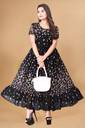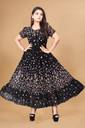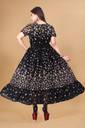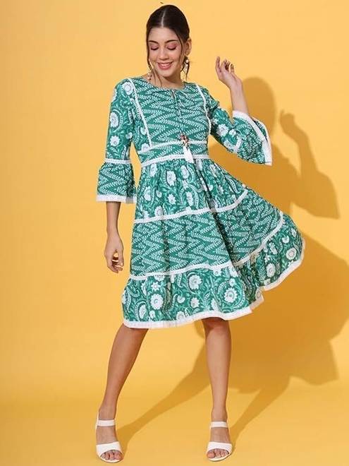 Crafted from soft, breathable fabric, it features a round neckline with a tie-up detail and puff sleeves that add a touch of femininity. The gathered waist flows into a beautifully flared hem, giving the dress a graceful silhouette.
