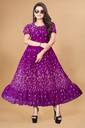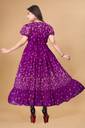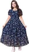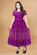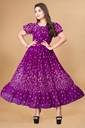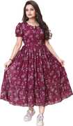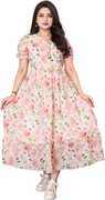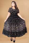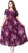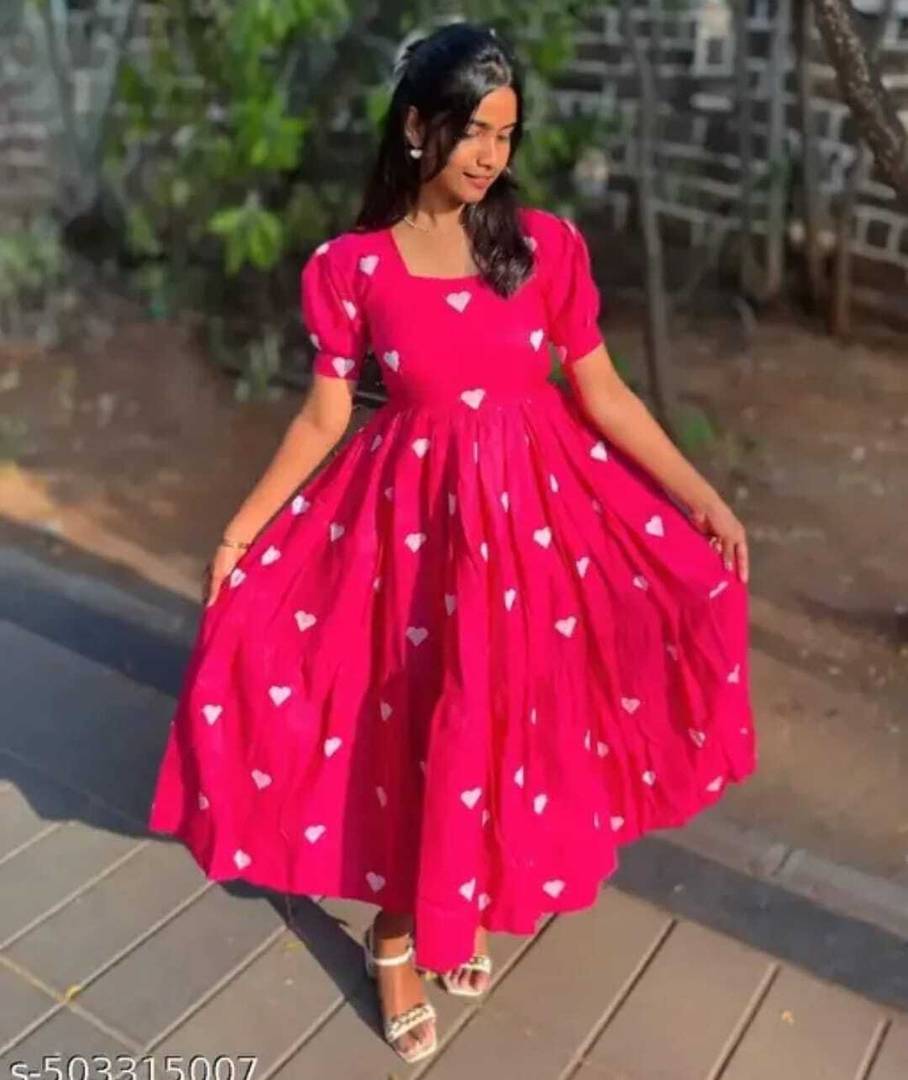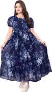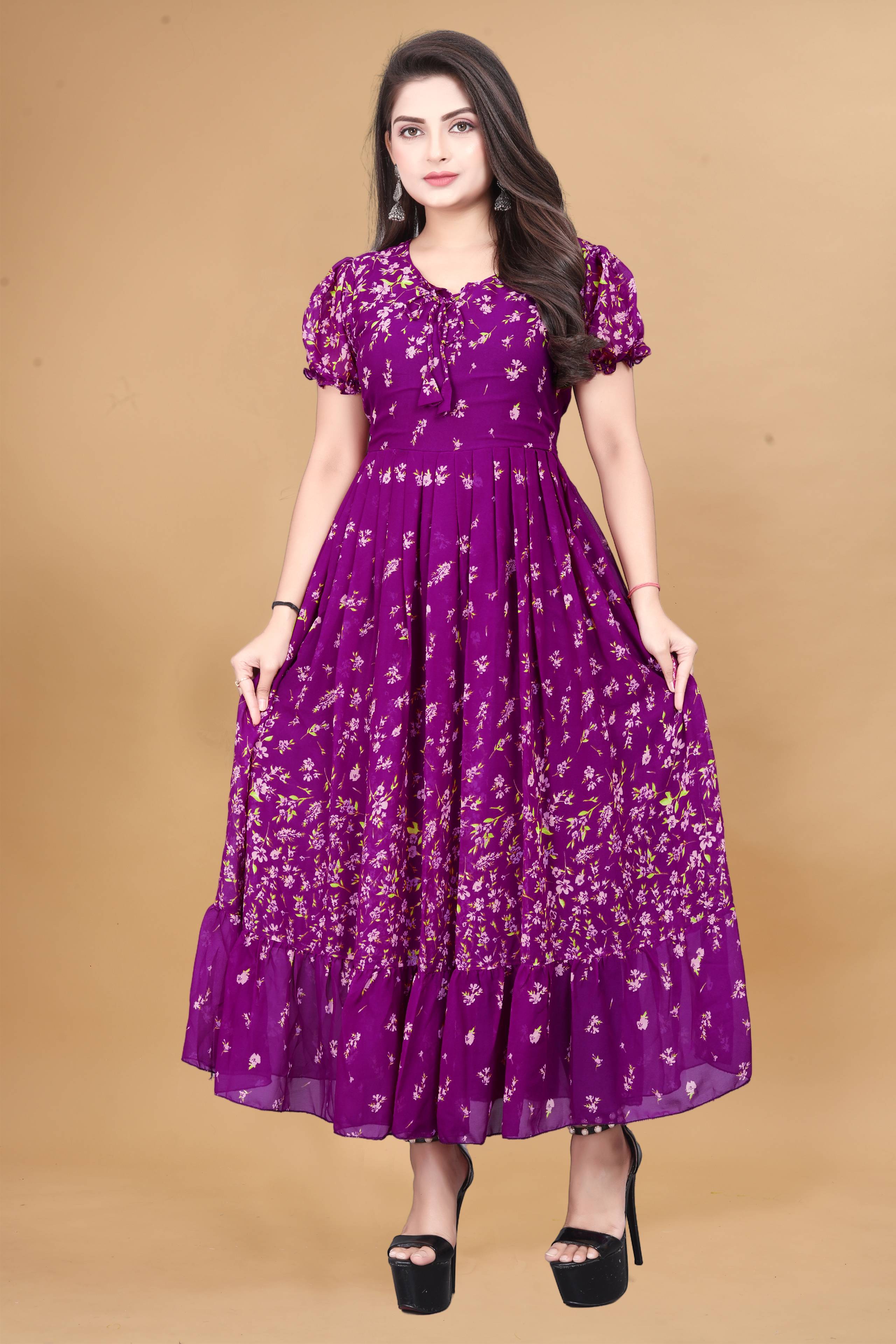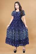 Crafted from soft, breathable fabric, it features a round neckline with a tie-up detail and puff sleeves that add a touch of femininity. The gathered waist flows into a beautifully flared hem, giving the dress a graceful silhouette.
