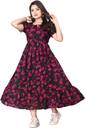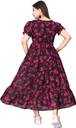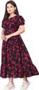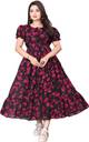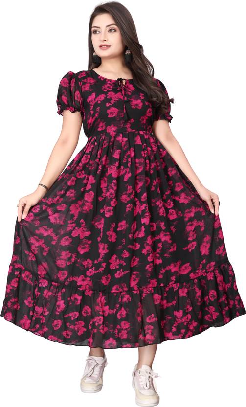 Step into elegance with this stunning black and pink floral midi dress. Designed with soft puff sleeves, a round neckline featuring a chic tie-up detail, and a gathered waist, it offers both comfort and style. The lightweight fabric drapes beautifully, creating a graceful flared silhouette that moves with ease. The vibrant pink floral print against a deep black base adds a touch of bold femininity, making it perfect for both day and evening occasions. Pair it with heels for a dressed-up look or sneakers for casual outings.