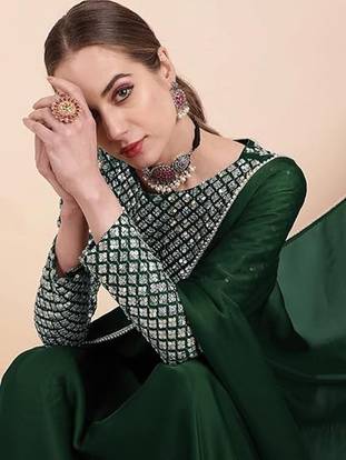 QEXTY Solid/Plain, Embroidered Bollywood Silk Blend Saree (Green)