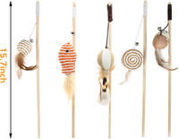 Qpets Premium Cat Toy Interactive Cat Toys Set of 5 Cat Teaser Wand Pet Toy for Cat Activity Fishing Rod with Mouse Natural Feathers Toys for Kittens to Play Cat Games and Toys Mouse Toy Wooden Fetch Toy, Stick For Cat