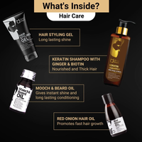 As part of your hair care routine, you have hair styling gel that provides long-lasting shine, so you don't have to worry about combing your hair in the middle of an event or while traveling. The Keratin shampoo with ginger and biotin helps to nourish your hair and maintain your hair density. The Mooch and beard oil in this pack provide instant shine and long-lasting conditioning for your moustache and beard. Additionally, the red onion hair oil in this pack promotes hair growth faster and also retains the natural texture of your hair.