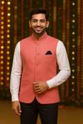 Elevate your ethnic charm with this premium QTSY Men's Waistcoat, crafted from high-quality fabric for a rich and elegant look. The coral pink color adds a modern twist to traditional style, making it perfect for weddings, parties, and festive occasions. The mandarin collar and front button closure give it a sophisticated appeal, while the three-pocket design ensures both utility and fashion.