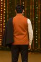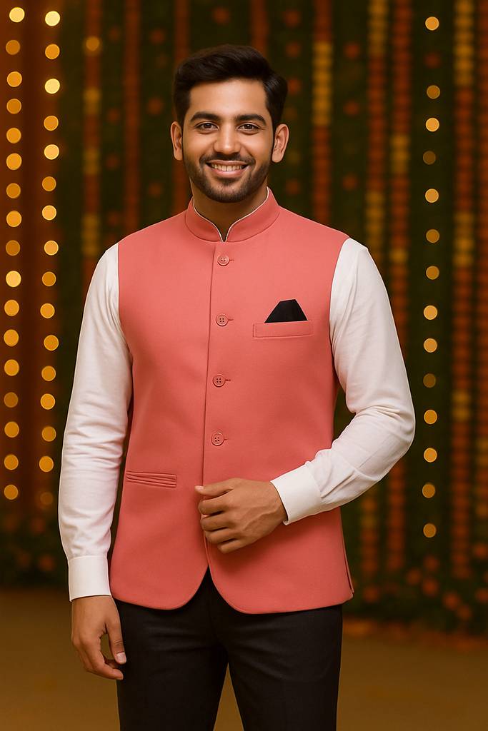 Elevate your ethnic charm with this premium QTSY Men's Waistcoat, crafted from high-quality fabric for a rich and elegant look. The coral pink color adds a modern twist to traditional style, making it perfect for weddings, parties, and festive occasions. The mandarin collar and front button closure give it a sophisticated appeal, while the three-pocket design ensures both utility and fashion.