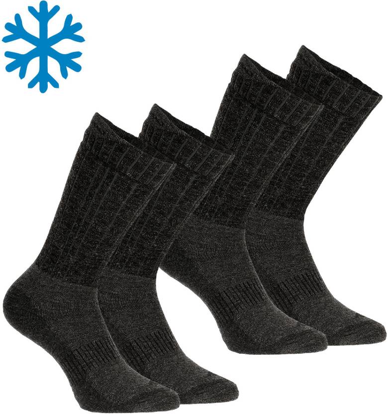 Boot height: adjust the height of the sock to the height of the boot and preferably choose high models if want more protection.,Pack of 2 pairs : This model is sold in packs of 2 pairs of socks in the same colour.,How to correctly select hiking socks : We use elastane in all our socks so that they conform to the shape of the feet and remain in place. Given that everyone's feet have different lengths, widths and volumes, we recommend that you try on your socks in store before buying them and that you try them out before going on a long hike.,How does my product warranty work? : This product is guaranteed for 2 years from the date shown on the sales receipt. A product covered by the warranty will be repaired or exchanged free of charge. The warranty covers product defects, excluding those resulting from normal wear and tear and improper use.,A score for comparing products' environmental impact : The environmental impact of the product is calculated based on its entire life cycle and using different indicators. A score from A to E is given to help you easily identify the most eco-friendly products by comparing products of a similar type. Decathlon is committed to this approach. Check out our efforts in the area of sustainable development: http://developpement-durable.decathlon.com/ Warmth : 50% wool overall and extra heat on the foot with 100% Merino wool.,Abrasion resistance : Multi-strand polyamide structure provides increased durability.,Odour control : Merino Wool naturally reduces the retention of body odours.,User comfort : 100% loop heel and toe for more comfort in use. These super-warm socks will provide maximum warmth thanks to their 100% merino wool knitted foot. Ventilation on the instep enables damp transfer and drying. Our designers have developed these socks for hikes in very cold weather. Enjoy the snow with the warmest in the range.