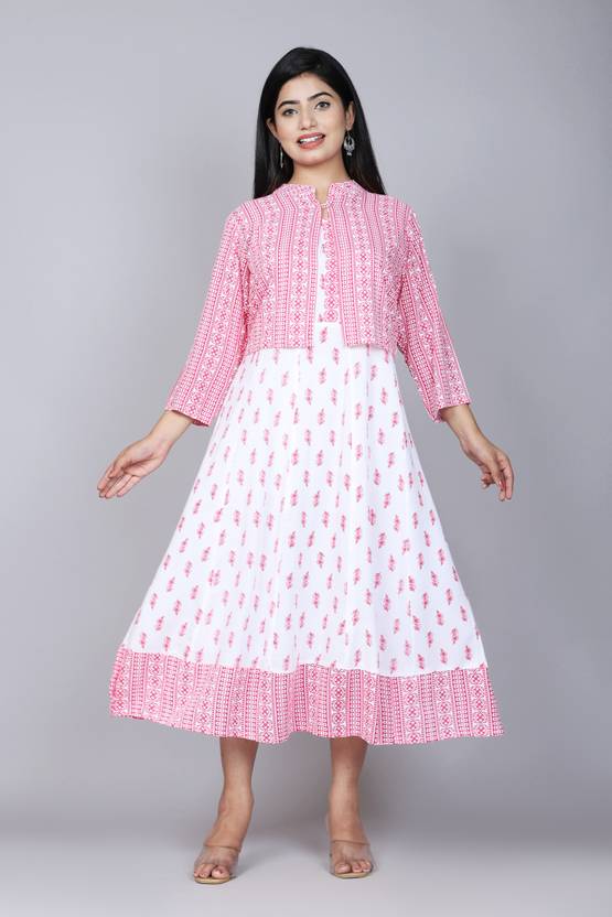 Pack of 2 Women Block Print Viscose Rayon Anarkali Kurta (White)