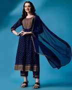 Thanks to the use of soft rayon for the kurta and pants, along with a breathable chiffon dupatta, this set ensures comfort throughout the day. The fabric is gentle on the skin, providing a pleasant wearing experience. The lightweight and breathable materials make it an ideal choice for warm as well as cold days, offering both comfort and style without compromising on elegance.