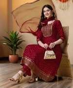 This Anarkali kurta\Kurti with pant and dupatta is a perfect mix of tradition and modern style, made with the finest rayon fabric for a comfy fit. cotton kurta set with dupatta is beautifully embroidered and adorned with lovely prints, making it ideal for any occasion. This suit set with dupatta includes the stylish kurti pant set for women with dupatta, comfy pants, and a chiffon dupatta that adds a touch of sophistication. QUEENSFAB pays attention to detail, ensuring not just a pretty look but also a durable dupatta set kurti.