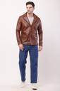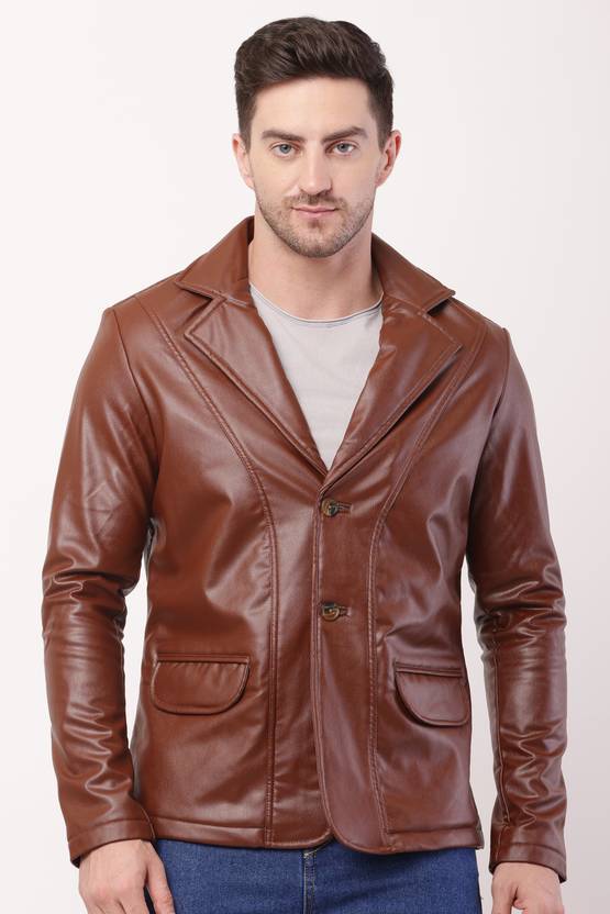is a contemporary take on a men's casual blazer/jacket, crafted from faux leather in a rich, deep brown color.
