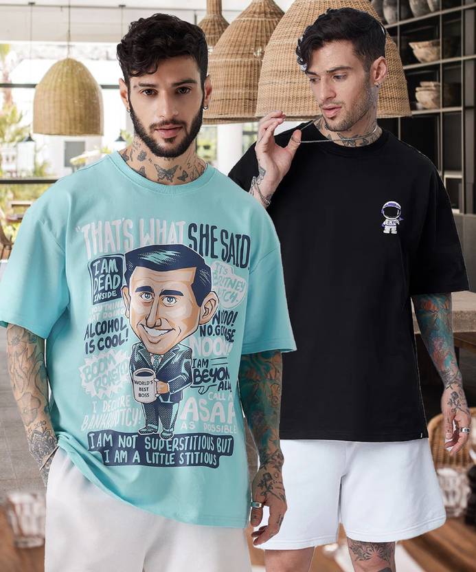 QUIN FLETCHER Pack of 2 Men Printed Round Neck Pure Cotton Multicolor T-Shirt