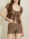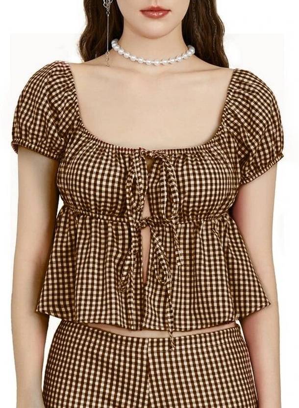 Casual Puff Sleeves Checkered Women Brown Top