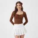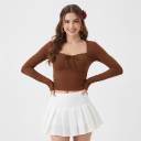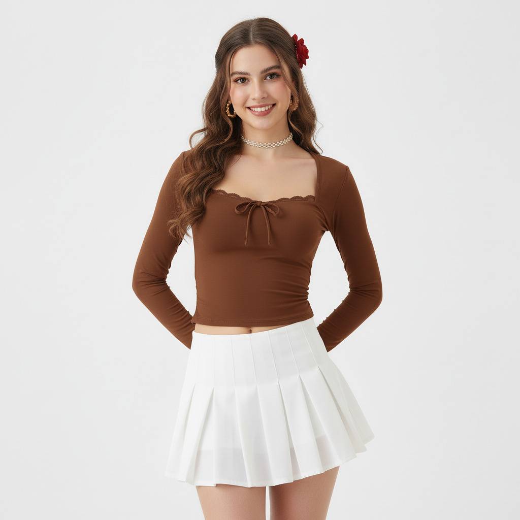 This stylish brown long-sleeve crop top features a flattering square neckline adorned with delicate lace trim and a charming tie-up detail at the bust. The fitted silhouette and cropped length make it a versatile piece for various occasions.