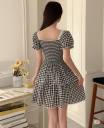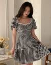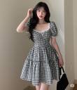 gingham dress, puff sleeve dress, vintage dress, cottagecore fashion, lace trim dress, square neck dress, summer dress, black and white dress, tiered skirt, mini dress, casual cute dress, retro dress