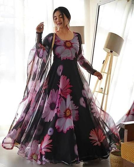 Crafted from high-quality georgette fabric, this Anarkali kurta and dupatta set ensures comfort without compromising on style. The georgette material offers a lightweight and breathable experience, making it suitable for extended wear during various events. The cotton lining adds an extra layer of softness against the skin, ensuring that you feel at ease throughout the day.