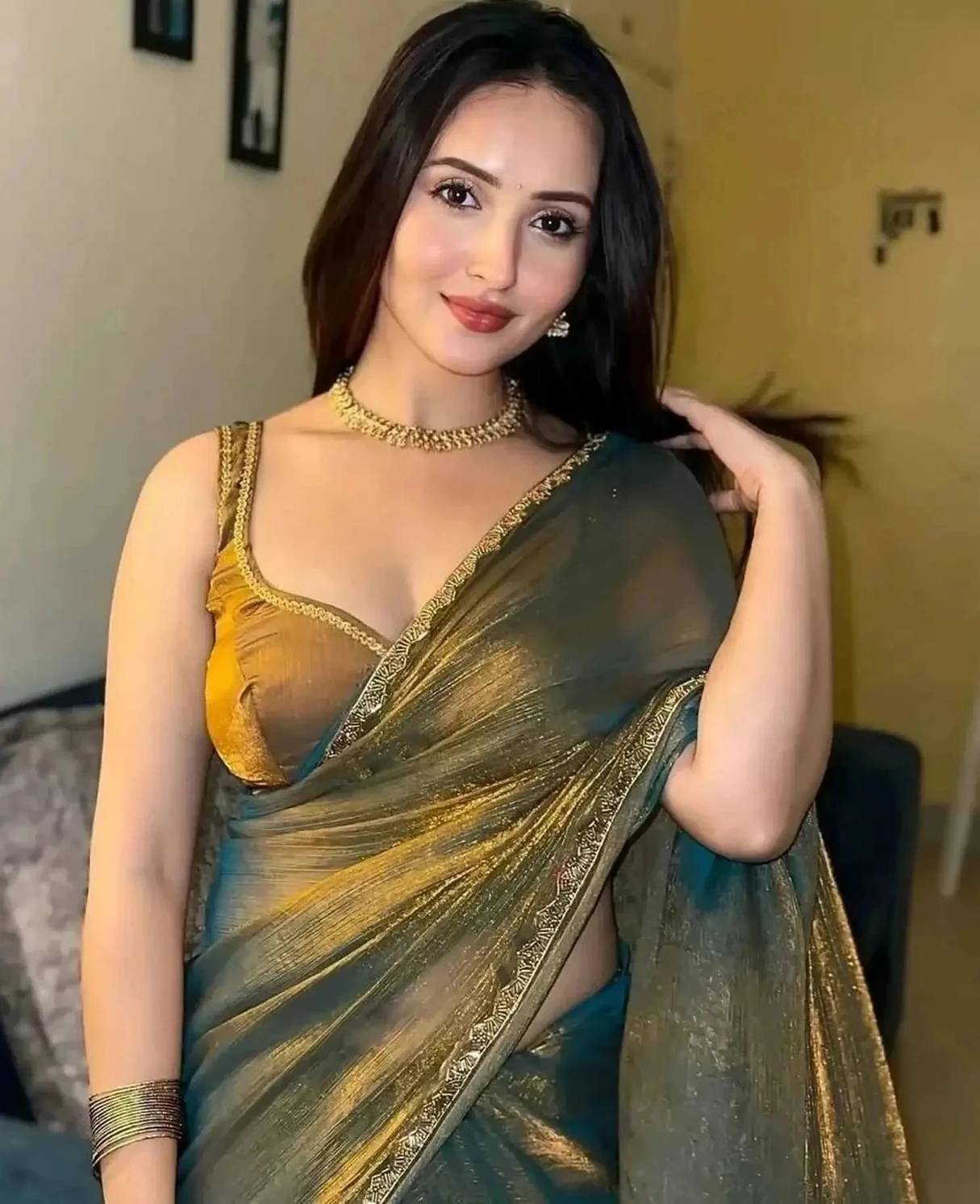 new model chiffon golden and peacock dual tone saree, and it's absolutely stunning! The Space silk chiffon like organza fabric gives it a rich, luxurious feel, and the golden color is perfect for festive occasions and weddings. It drapes beautifully, giving an elegant and graceful look. The fabric is soft on the skin, and the subtle sheen adds a touch of glam without being too flashy.