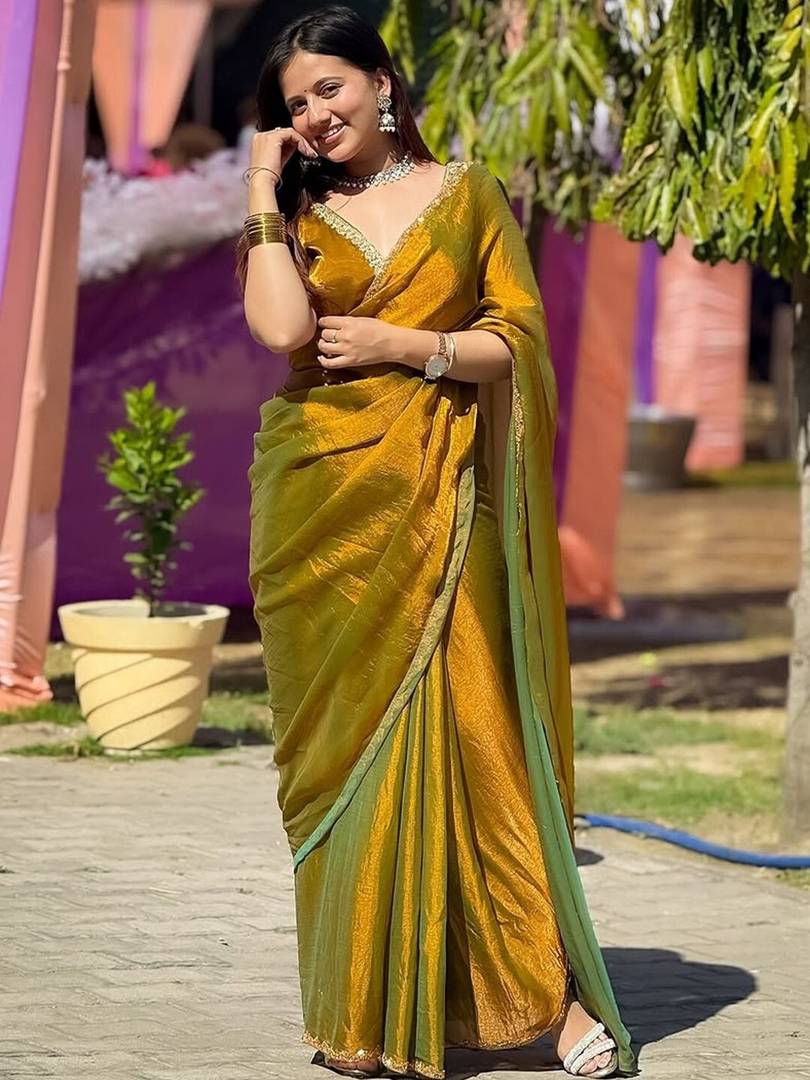 QVIDYA Solid/Plain Bollywood Organza, Silk Blend Saree (Yellow)