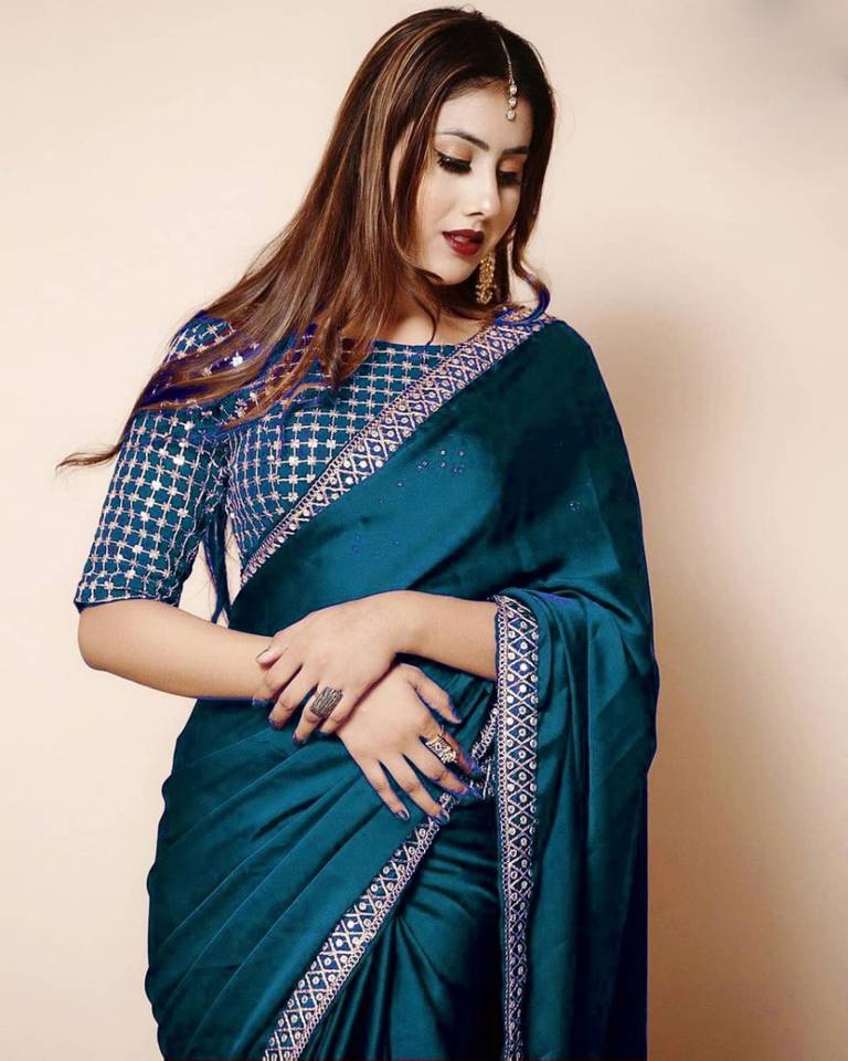 QVIDYA Solid/Plain Bollywood Silk Blend Saree (Dark Blue)