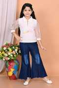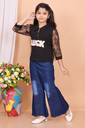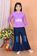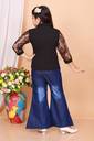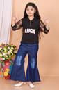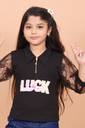 Let your little fashionista shine in this trendy black top and denim jeans combo, perfect for casual outings and festive fun. The black top features elegant lace sleeves and a playful "LUCK" patch in fuzzy multicolor letters, adding charm and personality. A short front zipper and collared neckline give it a sporty edge, while the flared blue jeans bring retro flair with faded detailing and frayed hems. Finished with comfy white shoes and a cute hair accessory, this look is all about confidence and comfort.