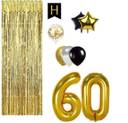 1pcs happy birthday banner, 1pcs foil curtain, 2pcs each golden and black star foil balloon, 1set number '60' foil balloon, 10pcs golden balloon, 10pcs black balloon, 10pcs silver balloon, 4pcs golden confetti balloon