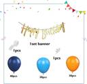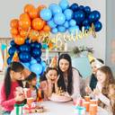 40 pcs of dark blue balloons, 30 pcs of light blue balloons, 30 pcs of orange balloons, 1 pc of arc, 1 pc of glue dots, 1 set of gold happy birthday cursive banner.