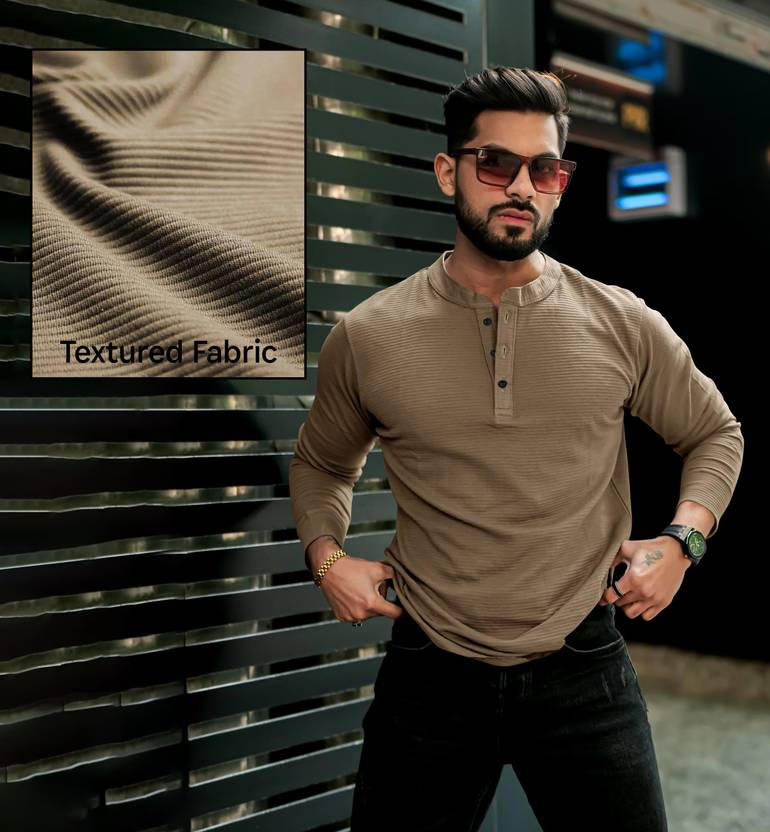 RABLY Solid Men Mandarin Collar Brown T-Shirt