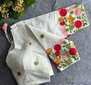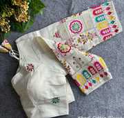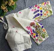 khadi cotton ke upar bahut Hi pyara embroidery ka blouse aapke liye uplabdh hai jo hamare pass 38 size mein ready hai aap ise 34 Se lekar 40 tak alter kara kar pahan sakte hain cotton thread work embroidery hai back open ya blouse padded hai