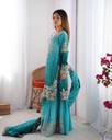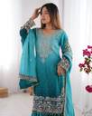 Exquisite festive ensemble features a floral embroidered Chinon silk kurta with full sleeves and a round neck, paired with a two-tone Colors sharara adorned with coding, sequence, and pearl work. The attached dupatta completes the set, offering a seamless and elegant look. Crafted from premium fabrics, sky & blue color kurta sharara set is ideal for weddings and special occasions, blending traditional embroidery techniques with refined design for a sophisticated appearance.