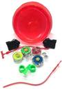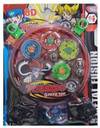 This set contains 4 pcs of bey-blades, 4 pcs of base rings, 2 pcs of launchers, 2 pcs of launchers sticks, 2 pcs of things for base tight, and 1 pc of stadium.