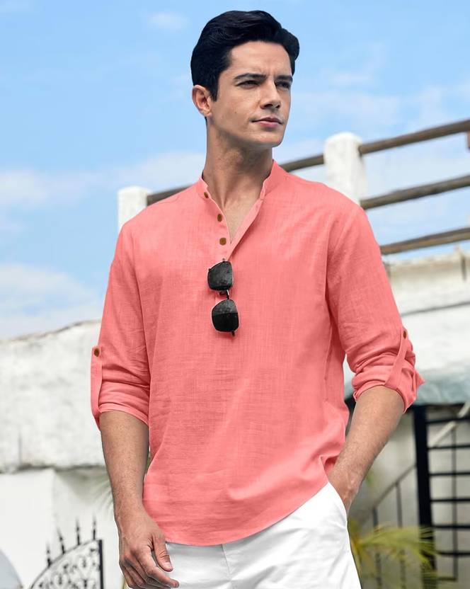 Men Solid Cotton Blend Straight Kurta (Pink)