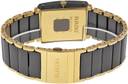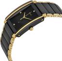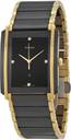 Pioneering. This 31 mm watch is accompanied by the Swiss made quartz movement, ETA E61.111, containing 8 jewels. Shown here, this Rado watch is offered in a black high-tech ceramic and yellow PVD gold colored stainless steel bracelet adding to the dependability of this quartz watch. A scratch resistant sapphire crystal accompanying with its black dial creates a classy watch. Adding to the watch is a 5 bar/50 meters water resistance rating. Rado Jubile timepieces offer elegance with carefully selected diamonds.