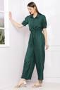 This vibrant mustard jumpsuit combines elegance and comfort for a chic, effortless look. The top features a collared shirt design with short, slightly puffed sleeves, giving it a smart, tailored appearance. The button-down front adds a classic touch, while the waist is defined by a fabric tie, accentuating the figure. The bottom half of the jumpsuit flows into wide-legged pants, offering ease of movement and a relaxed silhouette. The smocked detailing at the waist enhances the fit, making it both stylish and comfortable. Perfect for casual outings or semi-formal occasions, this jumpsuit blends sophistication with a bold color that stands out.