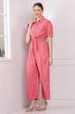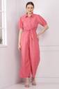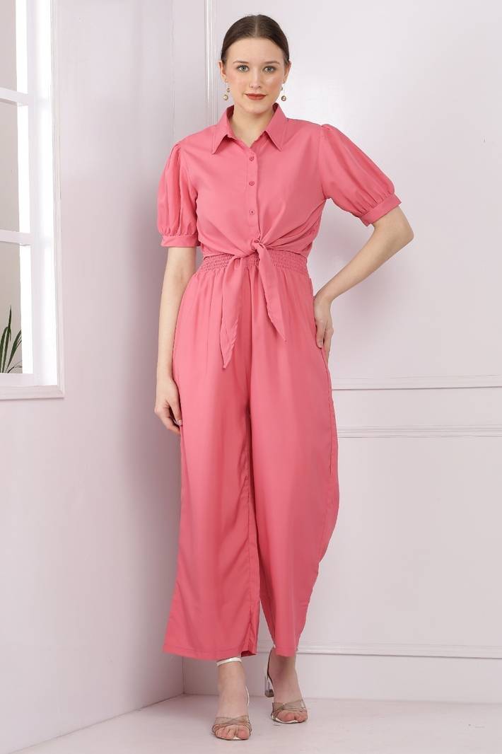 This vibrant mustard jumpsuit combines elegance and comfort for a chic, effortless look. The top features a collared shirt design with short, slightly puffed sleeves, giving it a smart, tailored appearance. The button-down front adds a classic touch, while the waist is defined by a fabric tie, accentuating the figure. The bottom half of the jumpsuit flows into wide-legged pants, offering ease of movement and a relaxed silhouette. The smocked detailing at the waist enhances the fit, making it both stylish and comfortable. Perfect for casual outings or semi-formal occasions, this jumpsuit blends sophistication with a bold color that stands out.