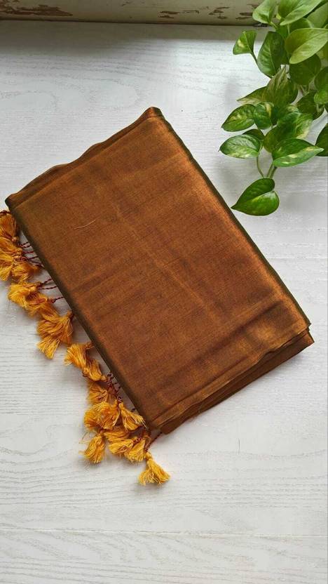 Raees Ethnic Woven, Solid/Plain Handloom Tissue Saree (Gold, Black)