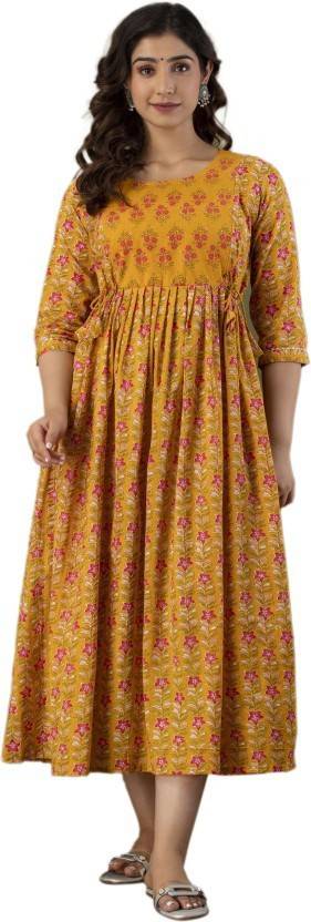 RAHUL TRADERS Floral Print Cotton Blend Stitched Flared/A-line Gown (Orange)