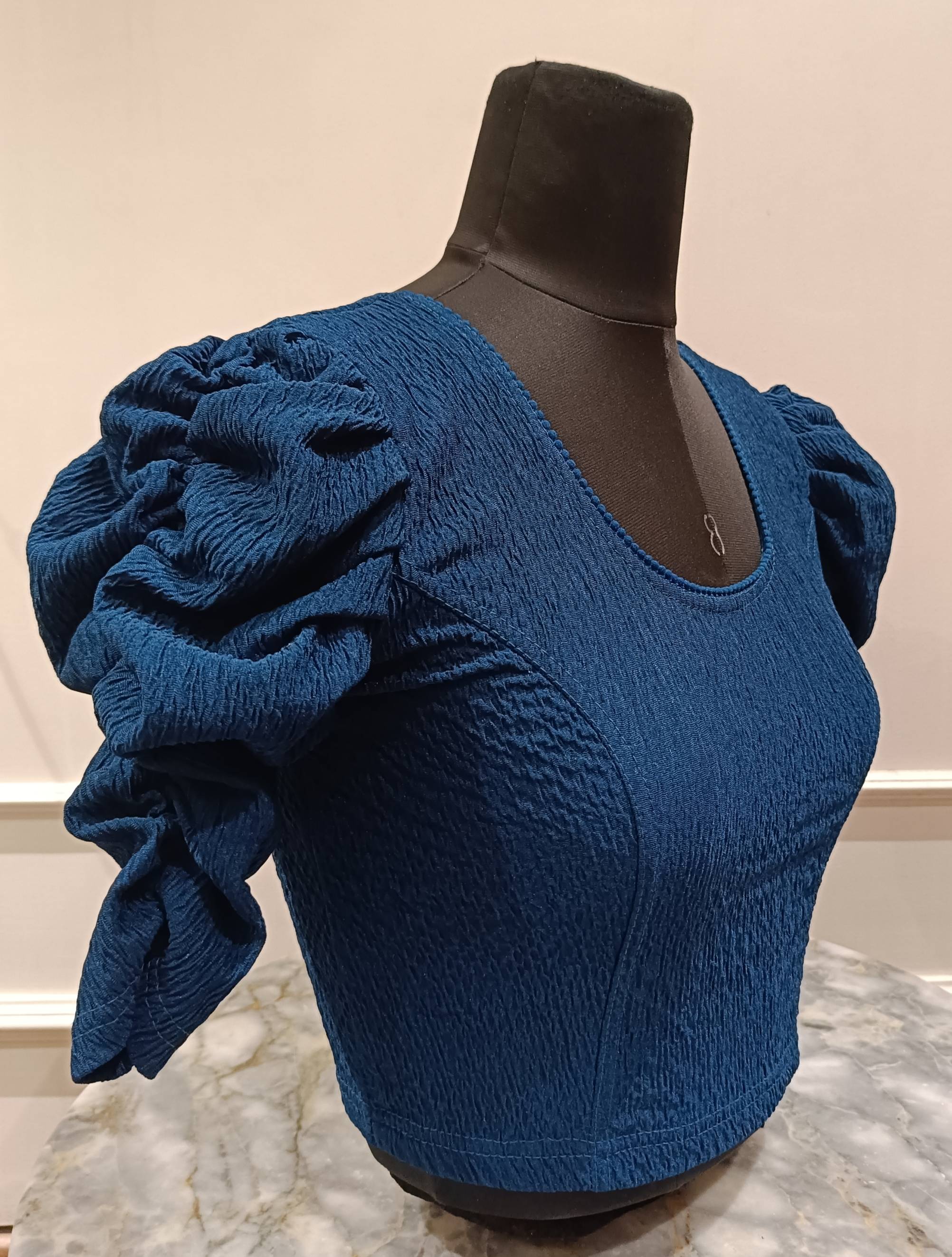 This stylish stretchable blouse is crafted from textured fabric that offers a snug and flattering fit. Featuring a scoop neckline at both the front and back, it is elegantly finished with a subtle lace-like piping along the edges. The short puff sleeves are beautifully ruched, adding a touch of drama and volume to the design. Perfect for pairing with sarees or lehengas, this blouse combines comfort with a trendy silhouette, making it a chic addition to any ethnic wardrobe.