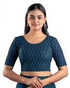 This stylish stretchable blouse is designed with elegant foil print work, featuring a round neckline and elbow-length sleeves. Made from comfortable cotton lycra fabric, it offers a flattering fit with a length of 14-15 inches. Available in nine vibrant colors and sizes ranging from 30 to 40 inches, it is perfect for adding a touch of sophistication to any outfit.