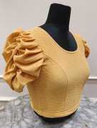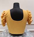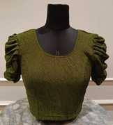 This stylish stretchable blouse is crafted from textured fabric that offers a snug and flattering fit. Featuring a scoop neckline at both the front and back, it is elegantly finished with a subtle lace-like piping along the edges. The short puff sleeves are beautifully ruched, adding a touch of drama and volume to the design. Perfect for pairing with sarees or lehengas, this blouse combines comfort with a trendy silhouette, making it a chic addition to any ethnic wardrobe.