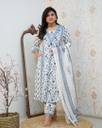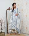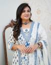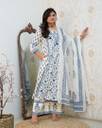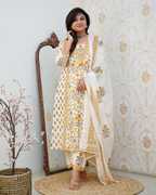 Elevate your ethnic wardrobe with this exquisite white kurta set adorned with stunning golden floral motifs and intricate border details. The ensemble features a graceful long kurta with three-quarter sleeves, paired perfectly with matching straight-cut trousers. The delicate print pattern combines traditional Indian aesthetics with contemporary design elements, making it suitable for both festive occasions and formal gatherings. The comfortable silhouette ensures ease of movement while maintaining a sophisticated appearance. The coordinated dupatta with ornate border work completes this elegant outfit. Crafted from premium fabric, this kurta set offers both style and comfort. The versatile white and gold colour combination makes it an ideal choice for various celebrations and special events. For best results, dry clean recommended. This timelessly elegant piece is perfect for those who appreciate refined craftsmanship and classical Indian fashion.
