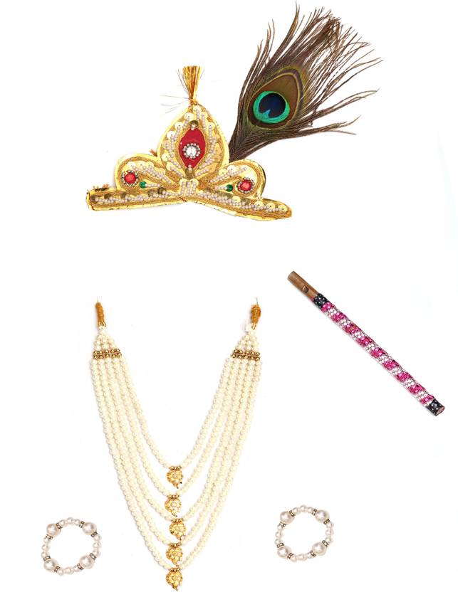 5 Items (Special 5 Layer Mala, MUKUT, Mor Pankh, 1 Pair Baju Band, Basuri FLUTE )